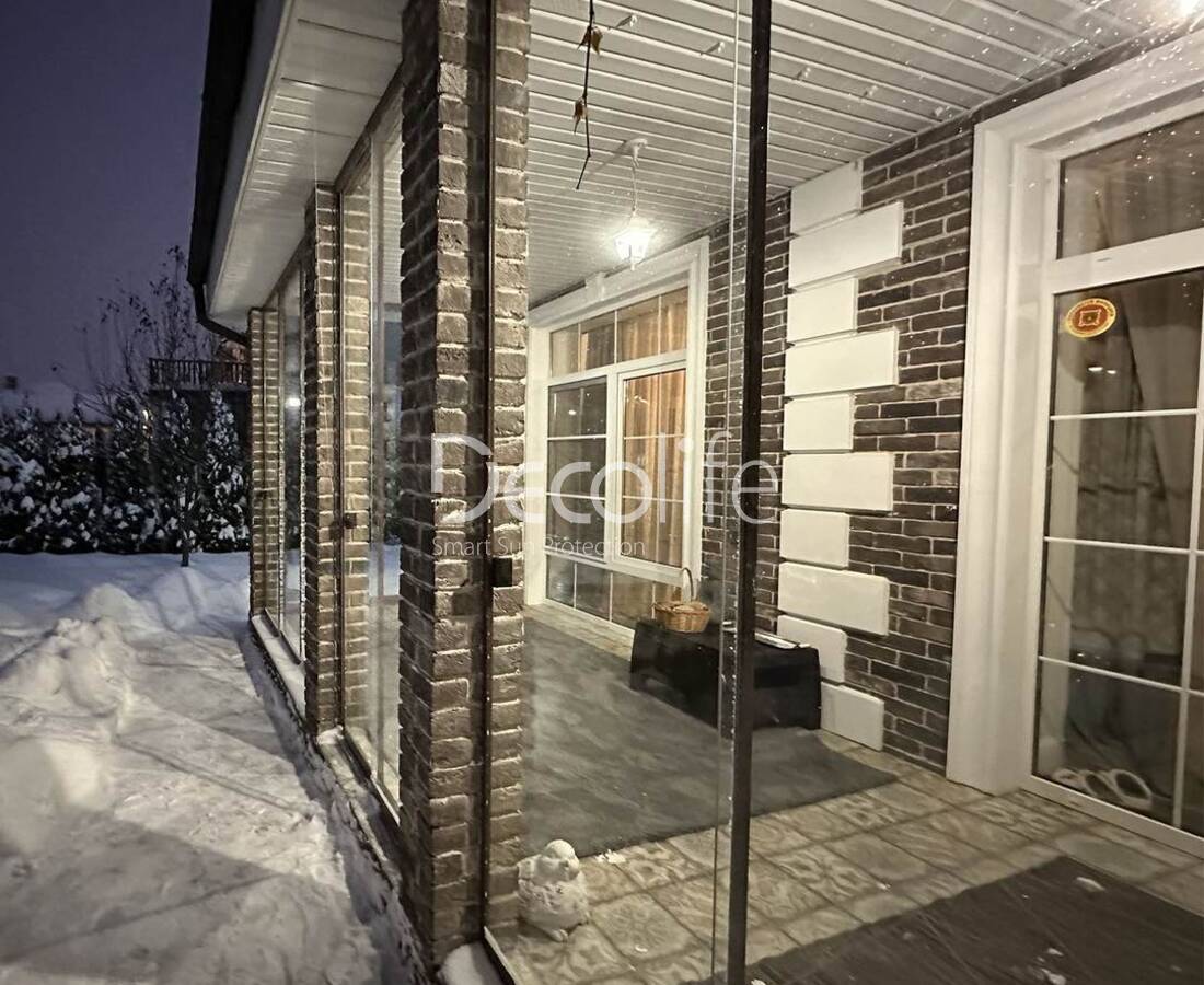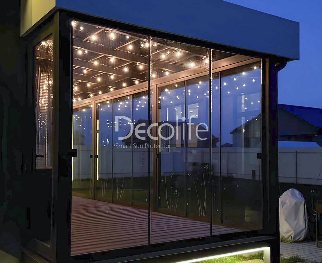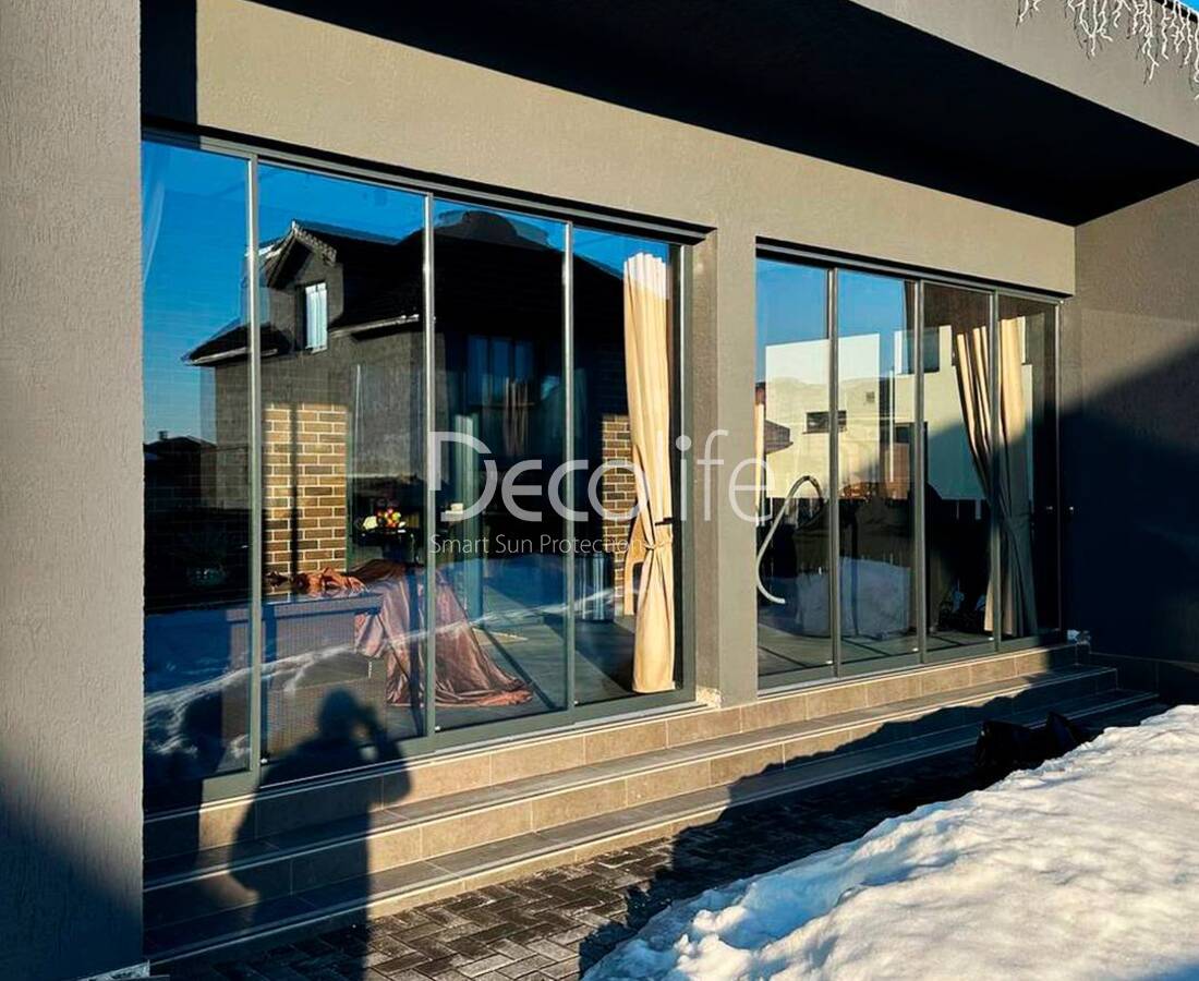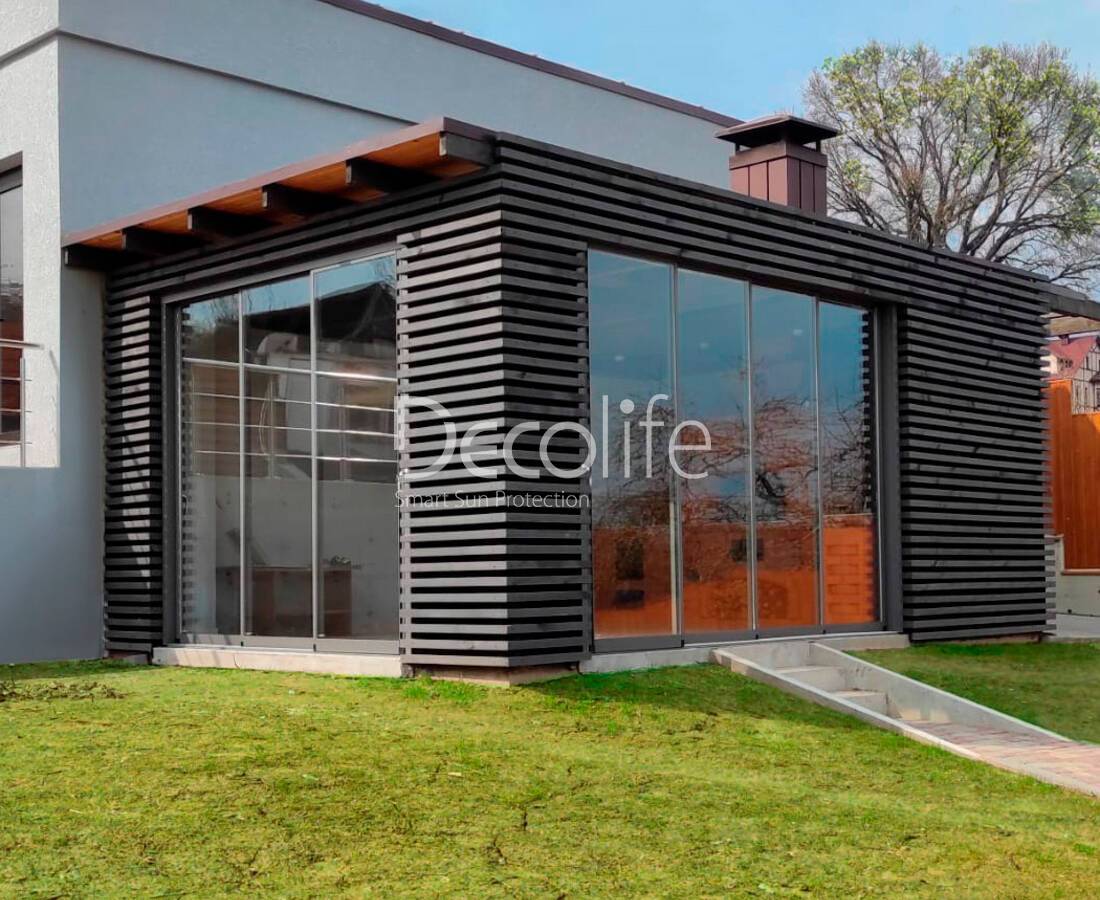 Остекление герметично закрывается, защищая террасу от влияния внешних факторов: сквозняков, холода, ветра, осадков. Количество слайдерных панелей подбирается с учетом характеристик и планировки объекта. Конструкции совместимы со всеми моделями пергол Decolife.